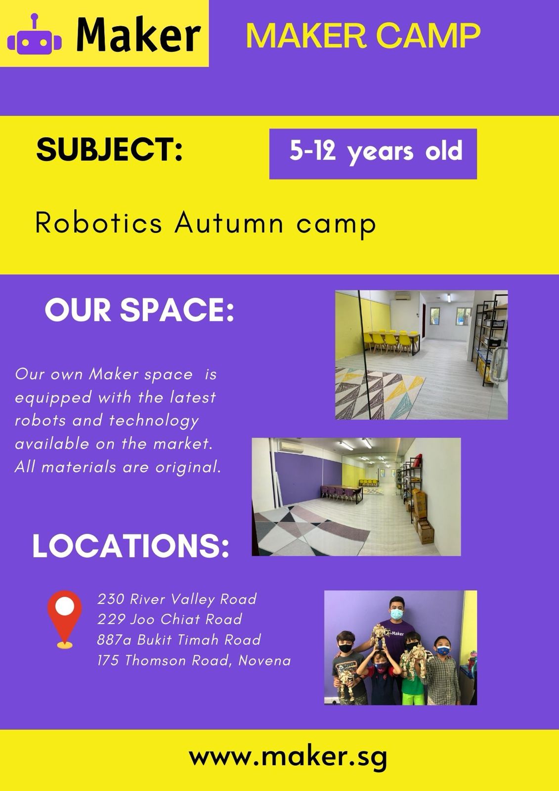 Our camp runs from 9 am to 4 pm. We offer participants a delicious yet healthy lunch and two amazing snacks each day. Maker's Autumn Camp welcomes kids from 5-12 years old. Campers will be divided into groups of up to 5 children of the same age. Your kids may experience all the advantages of our new programme at 4 locations – West, East, Centre, and Novena. If required, we can provide you with comfortable bus transportation.