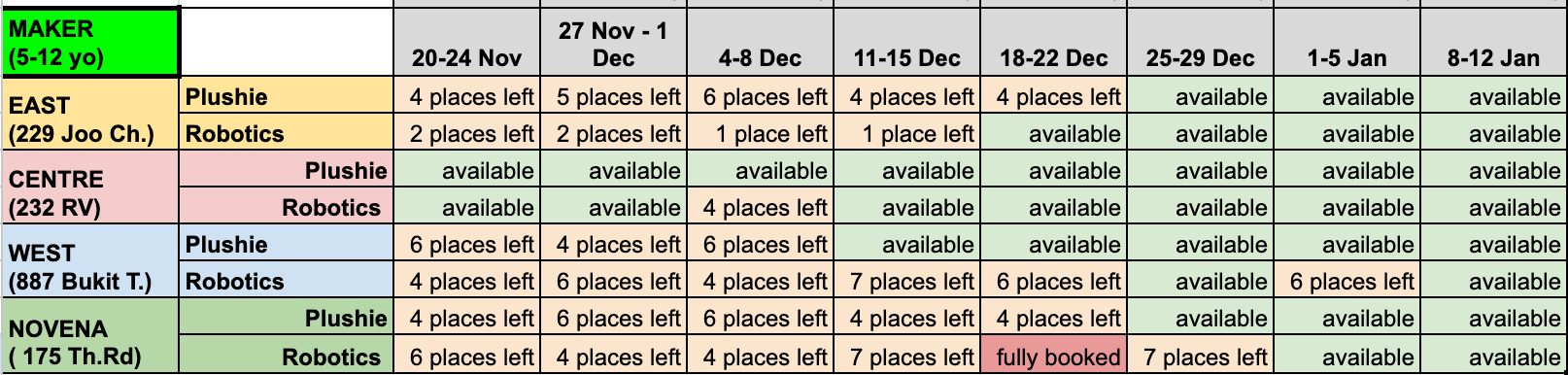 My son attended the maker class where get to construct all sorts of engineering projects with recycled waste items. Enjoyed ans it spurred his creativity and imagination for other projects. Will be returning in December!